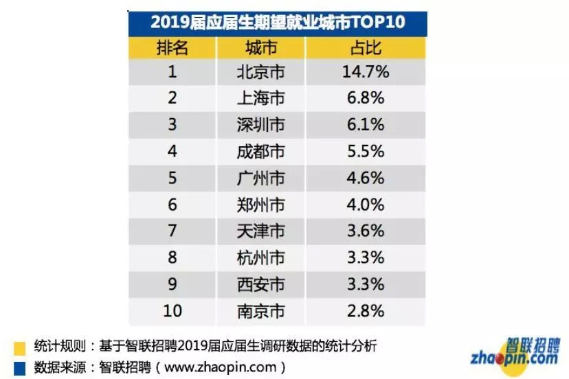 应届生期望就业的城市来看,选择北京为理想目的地的应届生占比14.7%,而上海和深圳则分别为6.8%和6.1%。