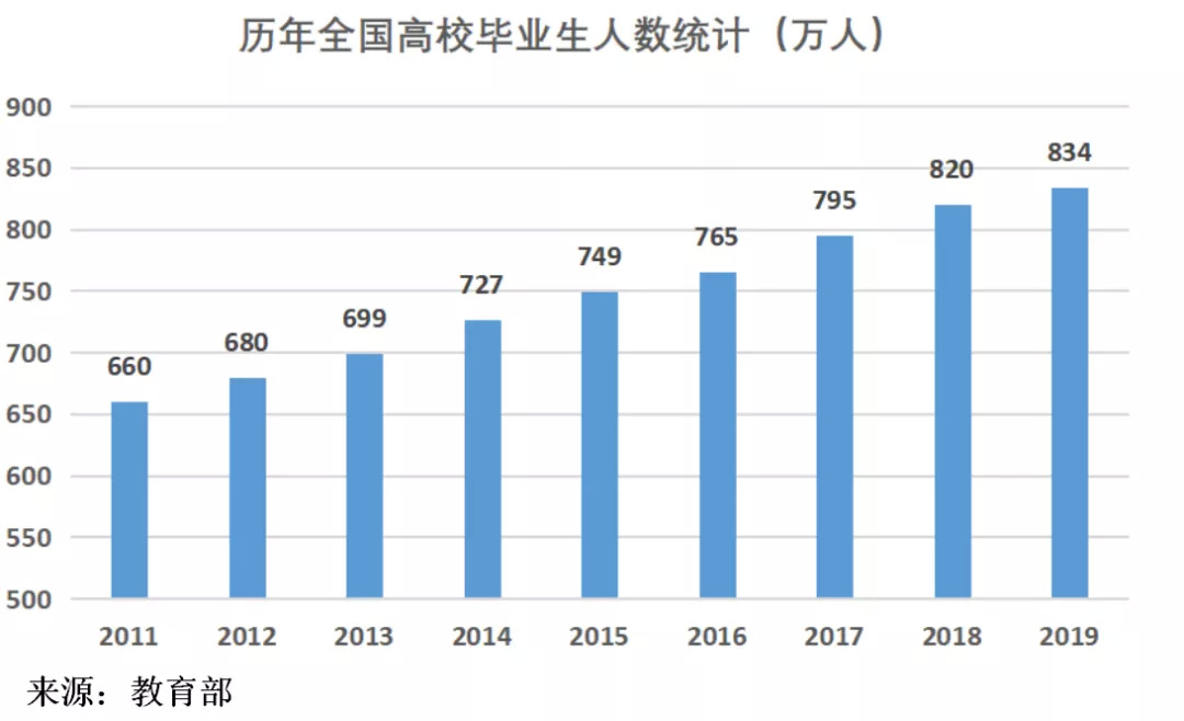 2019年全国普通高等院校毕业生人数为834万,历史新高。据《经济学人·商论》显示,2019年中国还要接收将近50万名海归毕业生。当前在校大学生数量在2500万以上,未来几年毕业生人数仍将是增长态势。也就是说,对于大学毕业生而言,就业没有最难,只有更难。