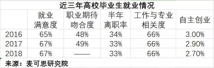 就业满意度分别为65%、67%、67%,收入低、发展空间不够是不满意的主要原因。工作符合自身职业期待的不足一半。种种因素,导致三年的毕业就业半年内离职率基本在三分之一。