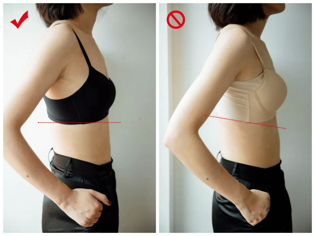 1. 穿好的内衣前后应该在同一水平线上。过大的底围就会出现前面我们提到的后侧上跑的情况。