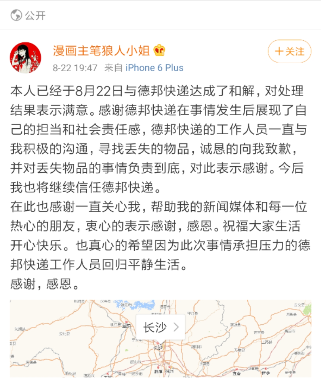 李女士微博@漫画主笔狼人小姐于8月22日下午发布博文称,“本人已经于8月22日与德邦快递达成了和解,对处理结果表示满意。感谢德邦快递在事情发生后展现了自己的担当和社会责任感,德邦快递的工作人员一直与我积极的沟通,寻找丢失的物品,诚恳的向我致歉,并对丢失物品的事情负责到底,对此表示感谢。今后我也将继续信任德邦快递。”