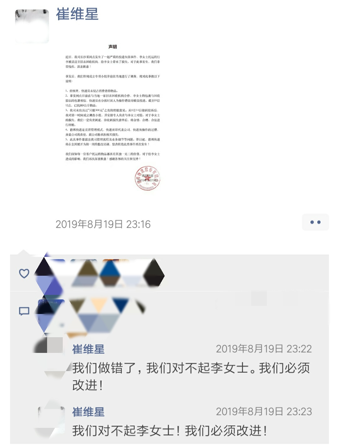 界面记者留意到,8月19日半夜,德邦董事长崔维星也在朋友圈中表态,称:“我们做错了,对不起李女士,必须改进!”