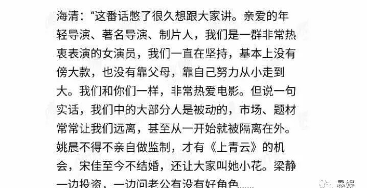 尽管海清的话中有不少不甚圆满的地方,但结合事后宋佳、姚晨、梁静、马伊琍共同发的微博来看,这席话应该是四位经过考虑后在青年影展闭幕式上,面对着众多的青年导演、制片人,讲的一席诚恳的真心话。