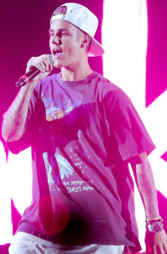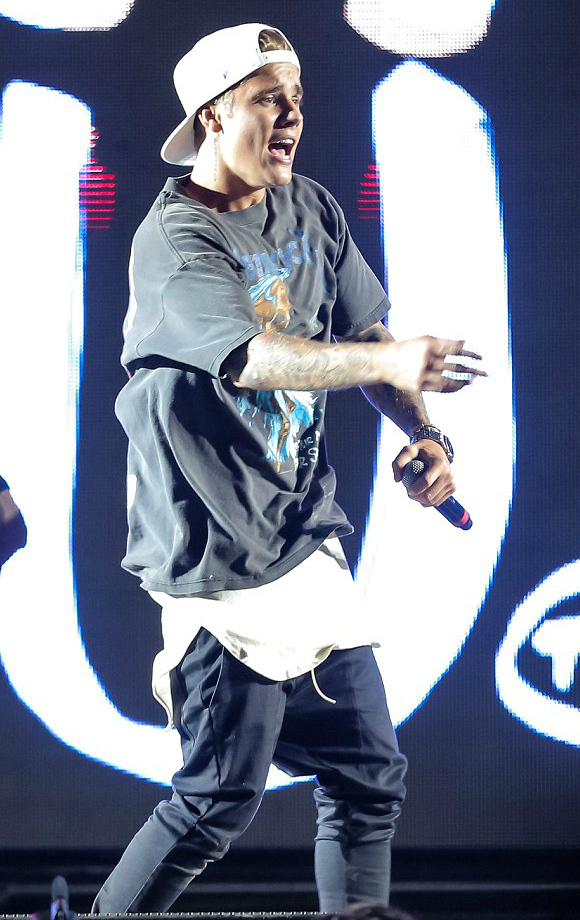 21岁的比伯有了一个新的面貌。他穿着灰色金属乐队T恤,与美国的DJ史奇雷克斯一起引爆舞台,high翻全场。
