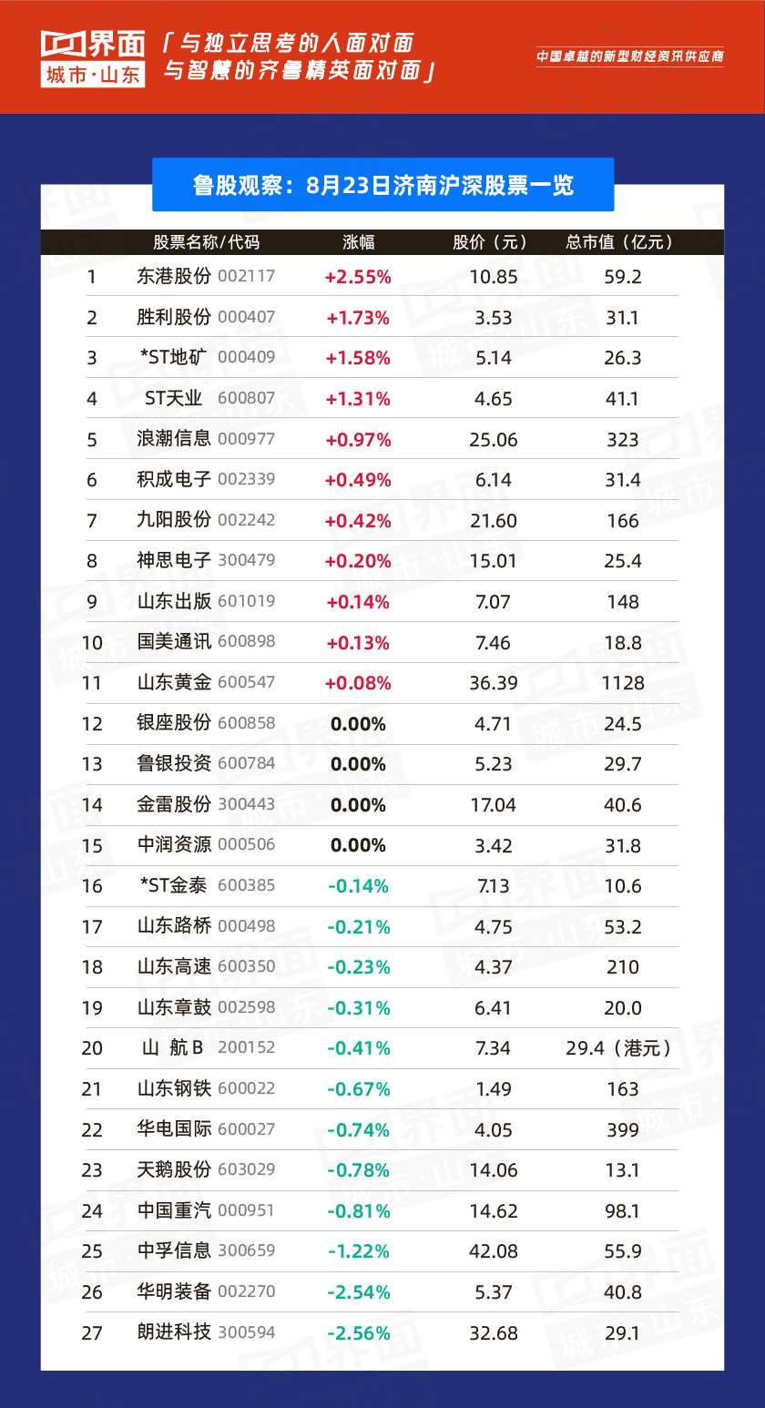 8月23日,山东省内沪深股票有83只个股上涨,105只下跌,18只与上一个交易日收盘价持平;