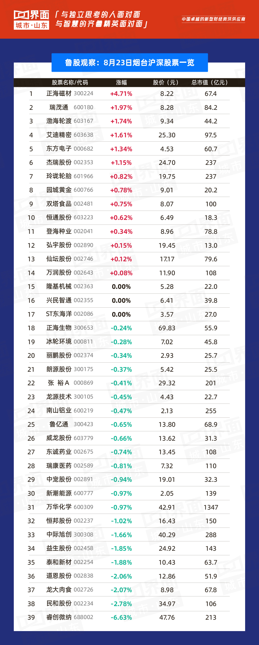 烟台市涨幅榜首:正海磁材(300224),涨幅4.71%,股价8.22元,总市值67.4亿元;