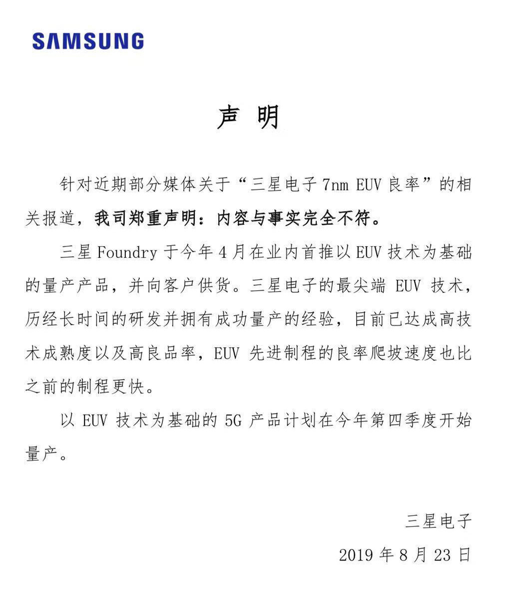 8月23日,三星声明称,三星Foundry于今年4月在业内首推以EUV技术为基础的量产产品,并向客户供货,目前已达成高技术成熟度以及高良品率,EUV先进制程的良率爬坡速度也比之前的制程更快。以EUV技术为基础的5G产品计划在今年第四季度开始量产。