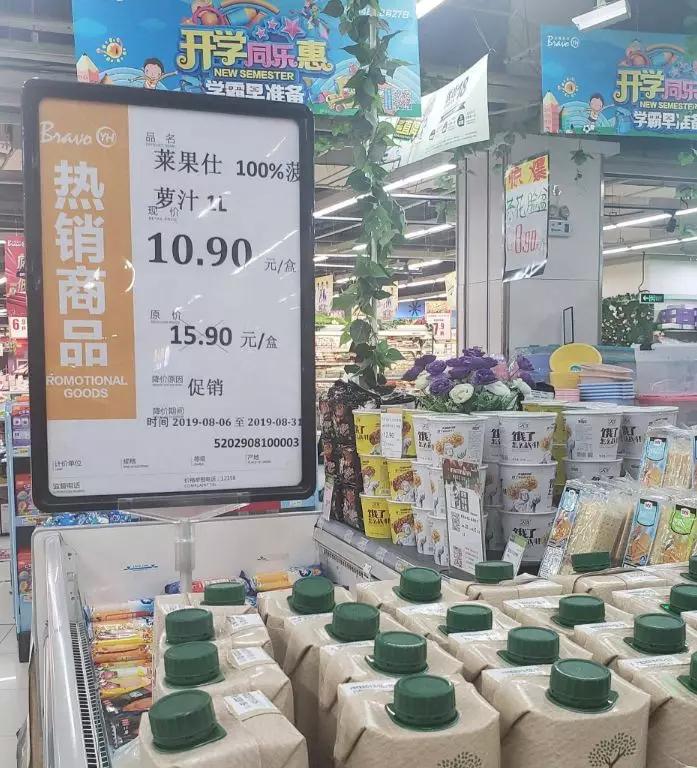 反观永辉,2017年推出的三个品牌的差异化调整都不明确,在2018年一下子推出了300个SKU,家居用品、休闲食品、干杂日配无所不包,直接把品牌的差异化弄的非常混乱, 再加上店面里同样混乱的SKU陈列和各式价签,让永辉优先在今天面临三个特别突出的问题,就以永辉超市在北京的育新店为例: