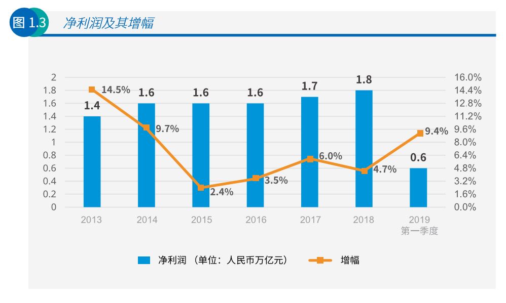 2018年度,中国银行业随着资产结构的持续调整,净利润增速放缓。商业银行实现净利润人民币1.8万亿元,比2017年度增加人民币825亿元,同比增长4.7%,增速较2017年度下降1.3个百分点。而随着去年年底贷款规模放开,商业银行加大信贷投放力度,资产增速有所企稳,2019年一季度商业银行净利润增速回升,同比增长9.4%。
