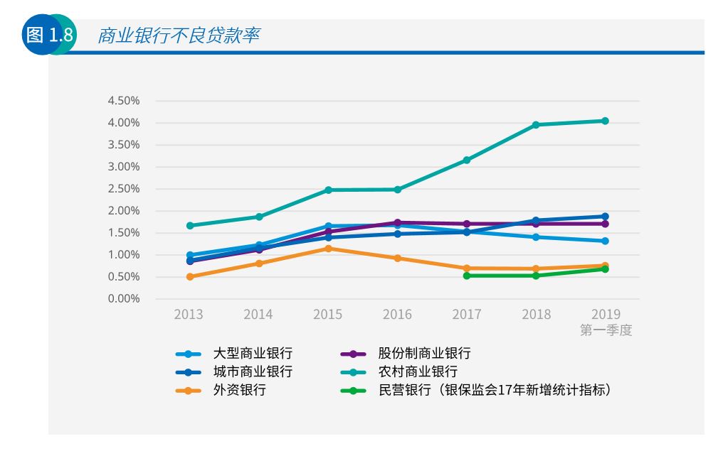 2019年一季度,不良贷款规模增速明显放缓,整体的信贷质量在稳步改善。2019年一季度末商业银行不良贷款余额为人民币2.16万亿元,较2018年末增加人民币0.13万亿元,上涨6.50%;商业银行平均不良贷款率为1.80%,较2018年末下降0.03个百分点。其中大型商业银行不良贷款率继续下降了0.09%至1.32%;股份制商业银行则保持平稳,维持在1.71%;城商行和农商行的不良贷款率继续攀升,但是上升幅度已经大大减少,分别上升了0.09%,信贷资产质量还需持续加强改善。