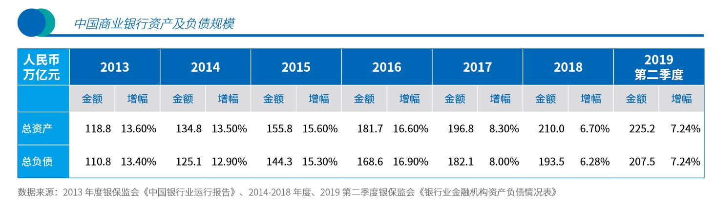 总体来看,2018年及2019年一季度,中国银行业总资产、总负债规模仍保持强劲的增长趋势。在经过了2018年的增幅收窄之后,2019年第二季度增幅又有明显回升,达到并超过了2018年全年的增幅水平。