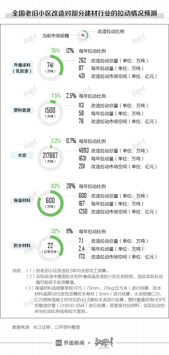 以建材行业为例,据长江证券测算,外墙涂料、塑料管道、水泥、建筑保温材料等多个品类的市场规模(包括产量和产值)均会受到改造拉动。产量拉动比例从2.2%到83%不等,产值拉动总额最低的为78亿,最高的为1250亿。