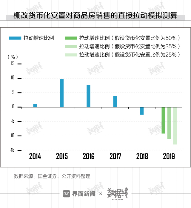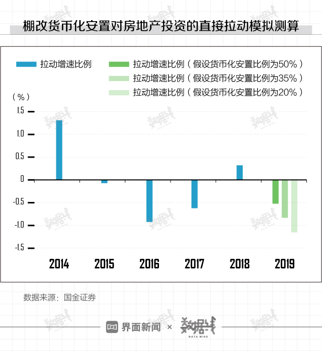 棚改计划数的缩减以及货币化安置比例的下降,将对商品房销售和房地产投资造成直接影响。据国金证券测算,在假设今年棚改计划中货币化安置比例为20%、35%和50%的情况下,棚改货币化对商品房和投资的直接拉动作用均为负数。