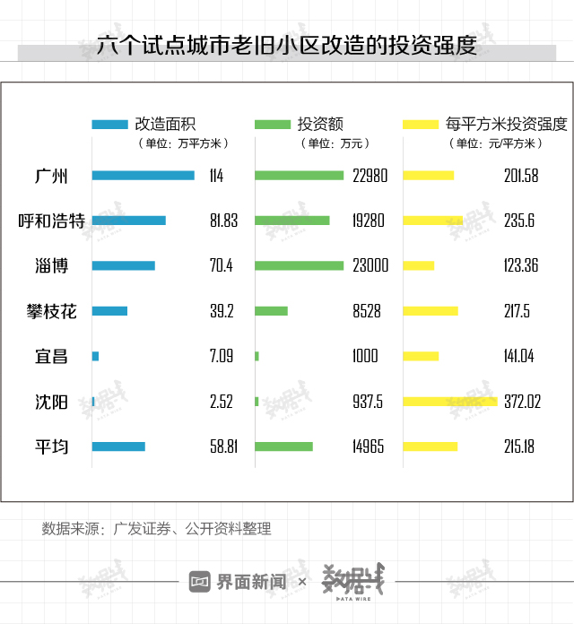 参考广州、呼和浩特、淄博、攀枝花、宜昌和沈阳等六个试点改造城市的投资数据,六城中每平方米投资强度最低的是淄博,为123.36元;最高的是沈阳,为372.02元;每平方米平均投资强度为215.18元。