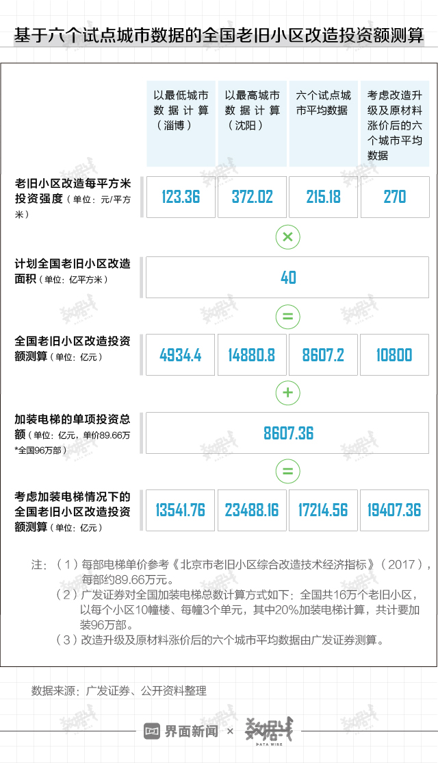 如果考虑加装电梯单项附加的8607亿投资额,那么全国老旧小区改造的投资总额将达万亿以上。河北、安徽等省份公布的改造计划也显示,未来老旧小区改造的每平方米投资强度在100-200元左右,与试点城市的投资数据相仿。