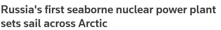 【俄罗斯首座海上浮动核电站横穿北极】周五,俄罗斯首座浮动核电站从北极港口摩尔曼斯克起航,为该国最偏远的地区之一提供电力。此举引发了环境保护组织的担忧。