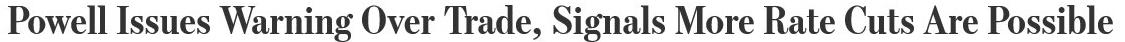 【鲍威尔就贸易问题发出警告,暗示有可能进一步降息】美联储主席鲍威尔就贸易紧张局势升级给美国经济带来的风险,央行缓冲冲突后果的能力受限发出了迄今为止最为强烈的警告。