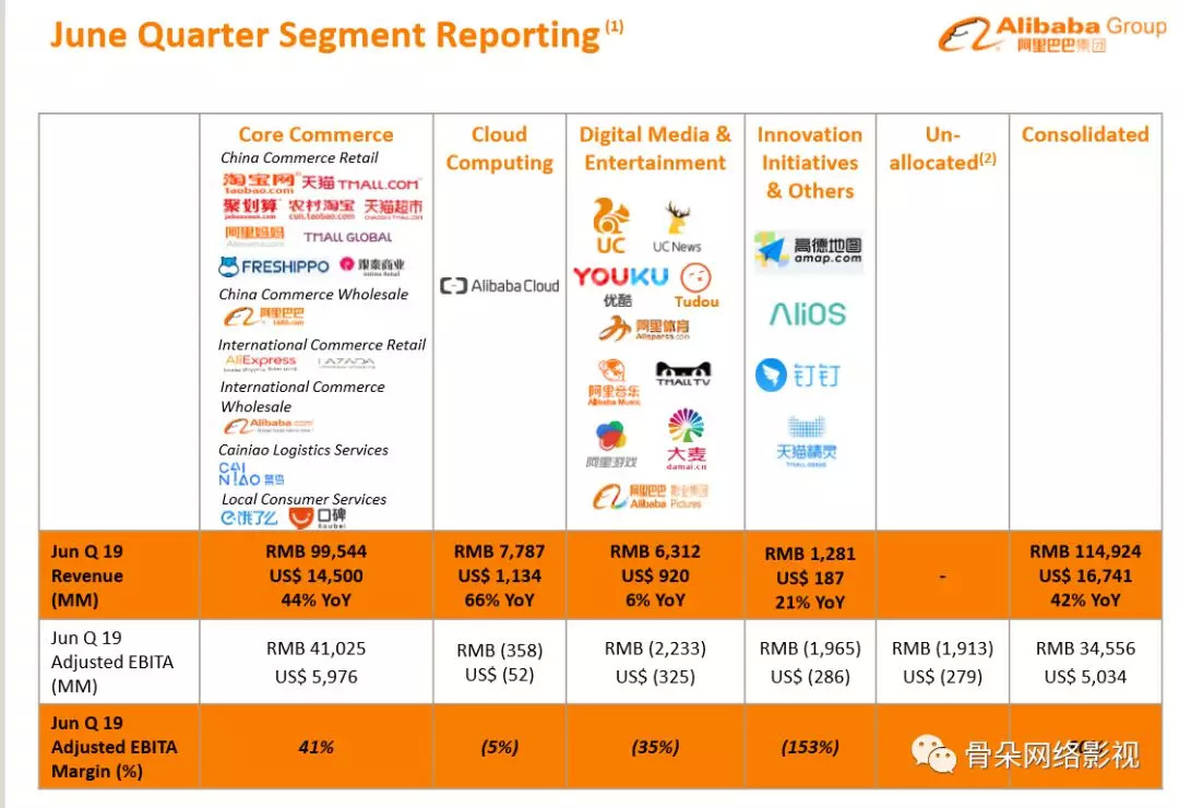 虽说阿里此次与腾讯在市场反馈的表现上冰火两重天,但具体落在视频业务板块,两者都是殊途同归。阿里财报显示,得益于优酷的订阅收入增长以及阿里影业的并表,阿里巴巴的数字媒体和娱乐业务收入为人民币63.12亿元,同比增长6%,增长幅度在所有收入板块中最小。在亏损方面,虽然分部的经调整EBITA亏损同比大幅收窄9亿元,降幅达到28.7%,但总量上仍达23亿元。
