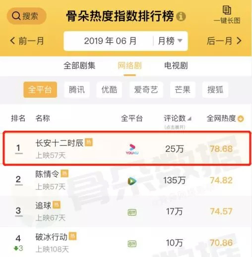 优酷在二季度贡献了豆瓣国内综艺口碑第一的《这就是街舞第二季》与今夏“国剧标杆”《长安十二时辰》,两部都是口碑热度兼得之作。《这就是街舞第二季》打破综二代魔咒,豆瓣评分8.9,多次在骨朵数据日榜上拿下第一;《长安十二时辰》豆瓣开画评分8.8,在开播4天后就拿下了骨朵热度体系6月榜单第一。