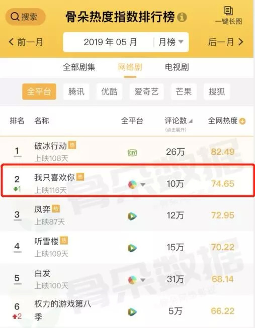 而腾讯视频二季度表现也不俗:IP改编剧《致我们暖暖的小时光》《我只喜欢你》《怒海潜沙&秦岭神树》在骨朵数据月度榜单上都拿下过亮眼的成绩。《我只喜欢你》在5月度榜单上热度指数为74.65,位列第二;《致我们暖暖的小时光》在4月度榜单上拿下第三的排名,《怒海潜沙&秦岭神树》打破盗墓类IP改编剧的偏见,在骨朵6月榜单全平台热度排名上位列第六位。综艺方面,《明日之子第三季》也在骨朵数据月度榜单位居第三,微博与百度指数热度表现不错。