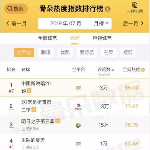 毫无疑问的是,目前平台在内容的竞争上已经进入白热化。爱奇艺在第二季度以《破冰行动》拿下现象级爆款剧集荣誉。综艺方面,爱奇艺爆款口碑两手都抓,两手都硬:《中国新说唱2019》在骨朵数据排行榜上拿下月度冠军,热度高居前三;《乐队的夏天》在拿下豆瓣评分8.7后,高居一周国内口碑综艺榜NO.1。