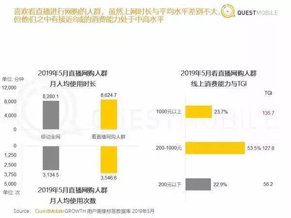 根据QuestMobile发布的《2019年“6.18”电商大报告》显示,直播网购用户群体的人均使用时长和次数均高于移动电商全网大盘数据,其中有接近8成的直播网购用户消费能力处于中高水平。