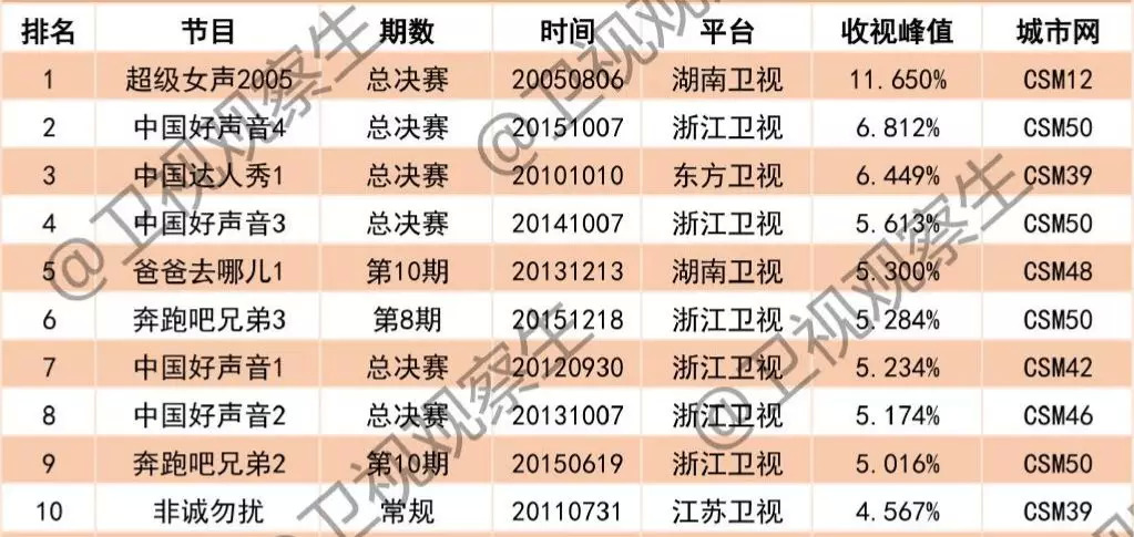 2005——2015十年卫视综艺收视峰值纪录Top10