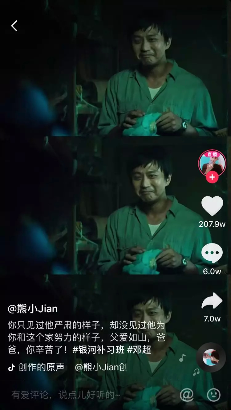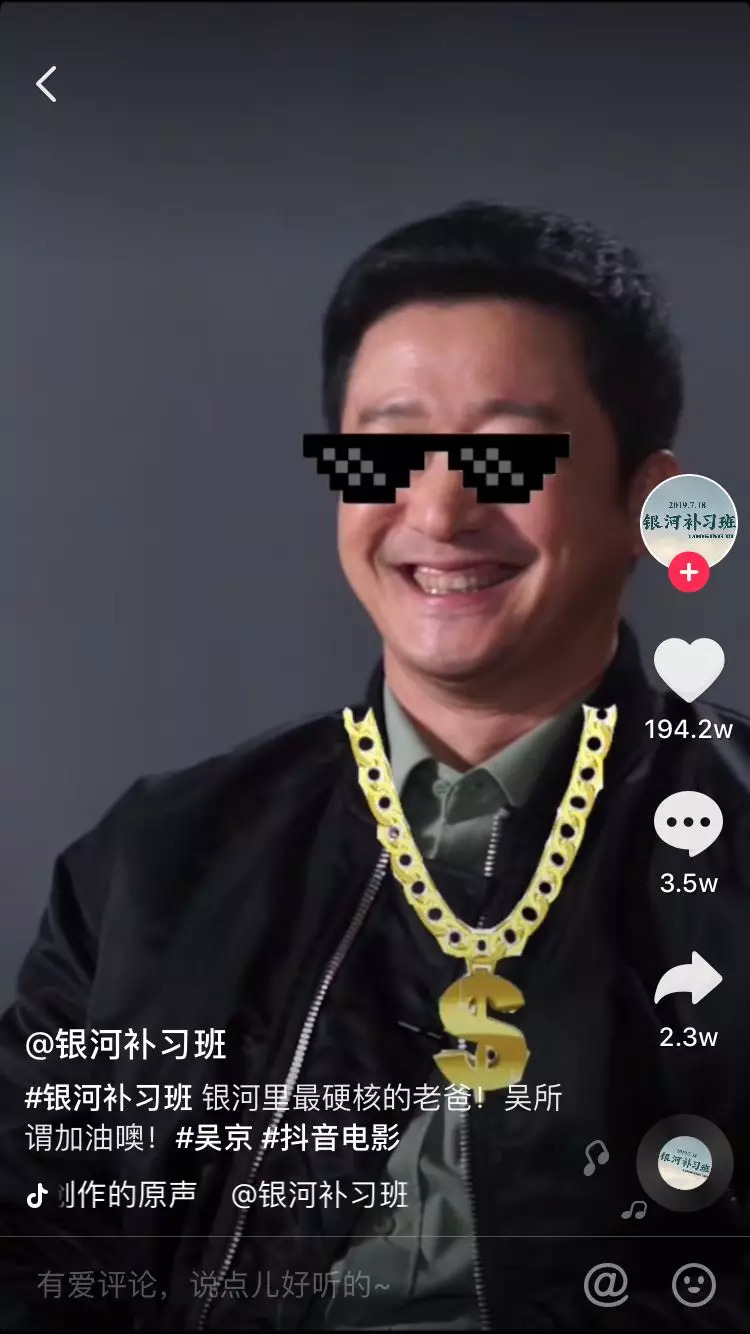 《银河补习班》在抖音主打父子情,发布的视频从花絮、幕后、采访都围绕着这一情绪点,点赞最高的还是一段采访吴京“最想让儿子学会什么”的视频,获得194.2万点赞。