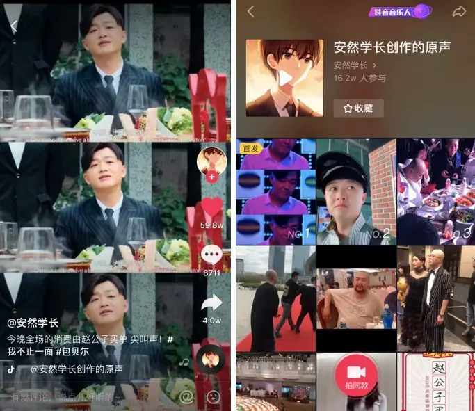 还有一种思路是用电影中的原声或台词制成BGM,经由抖音用户的反复使用,很容易产生魔性洗脑的效果。比如《“大”人物》的那句响彻抖音的“今晚全场的消费由赵公子买单”,有16.2万人使用此音效制作视频。