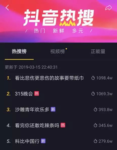 此前抖音的内容推送是算法机制,用户刷到什么全凭喜好,热搜提供了一个流量入口,是热点的风向标。以微博热搜为例,已经成为各家争抢的宣发阵地,抖音热搜也在往这方面发展。