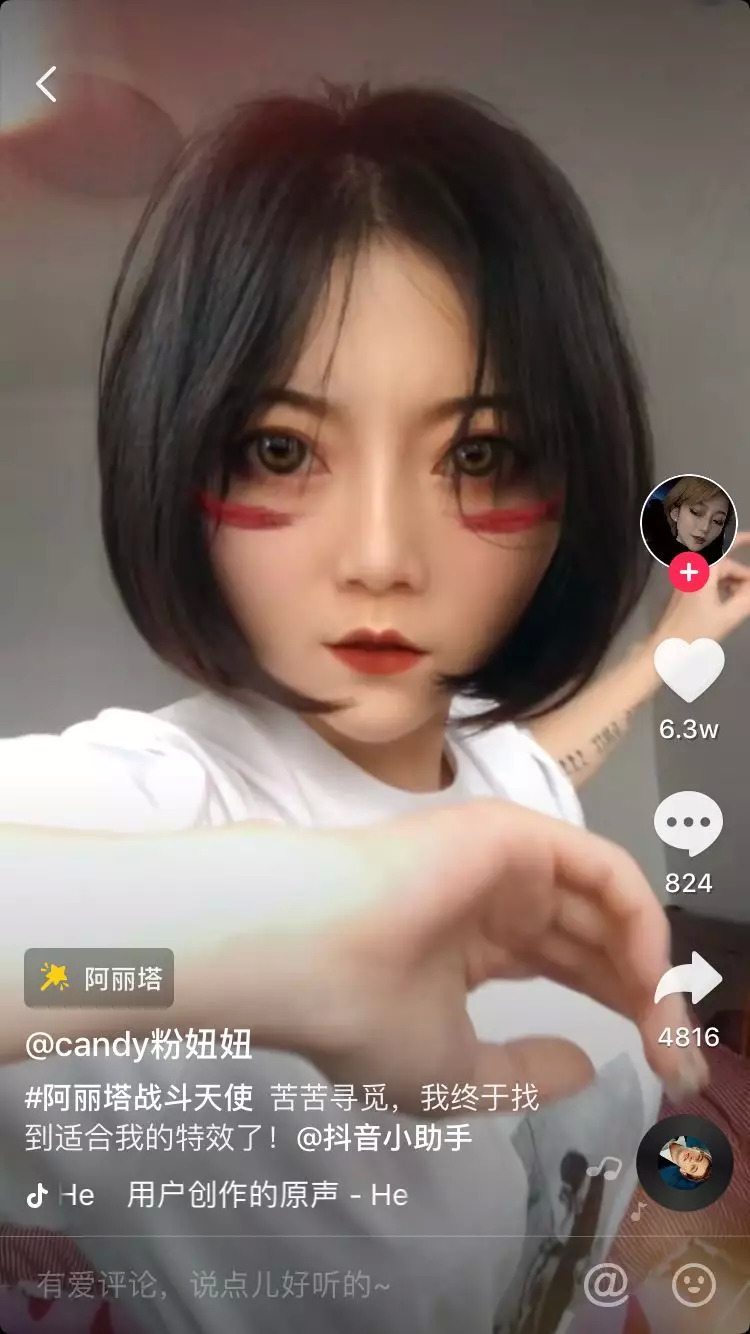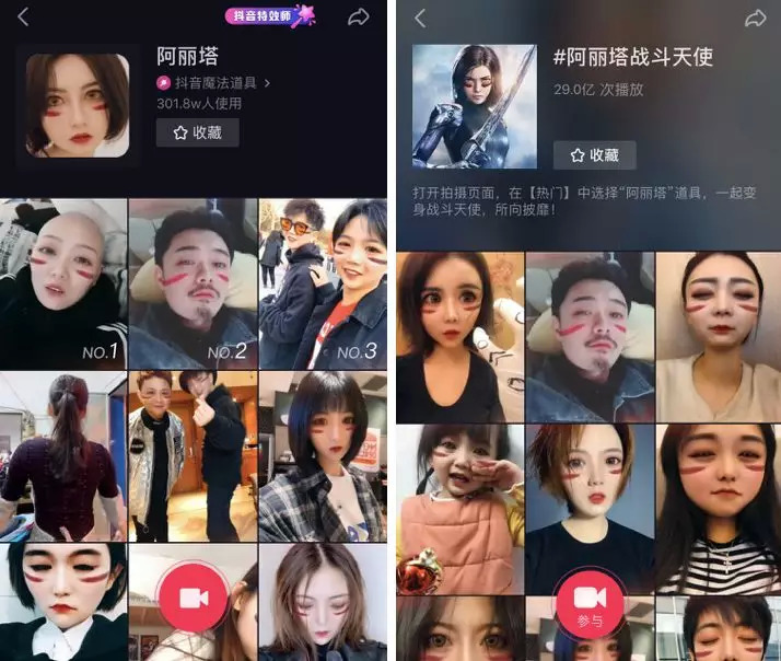 阿丽塔道具对形象的推广力度很大,全抖音都记住了这个大眼、血纹的妹子。据统计,有301.8万人使用了这个道具,连带着#阿丽塔战斗天使的话题也达到了29亿的播放量。