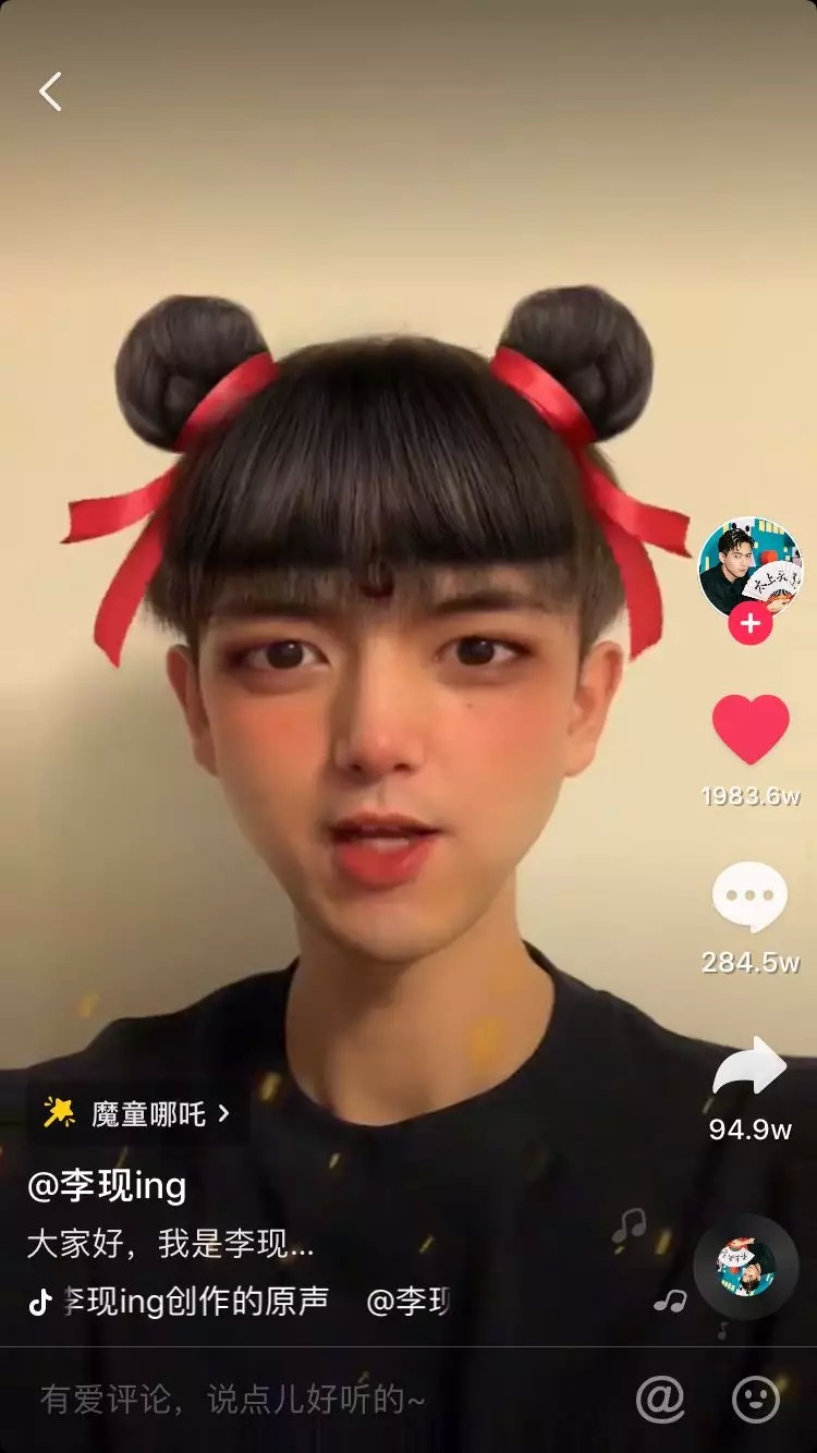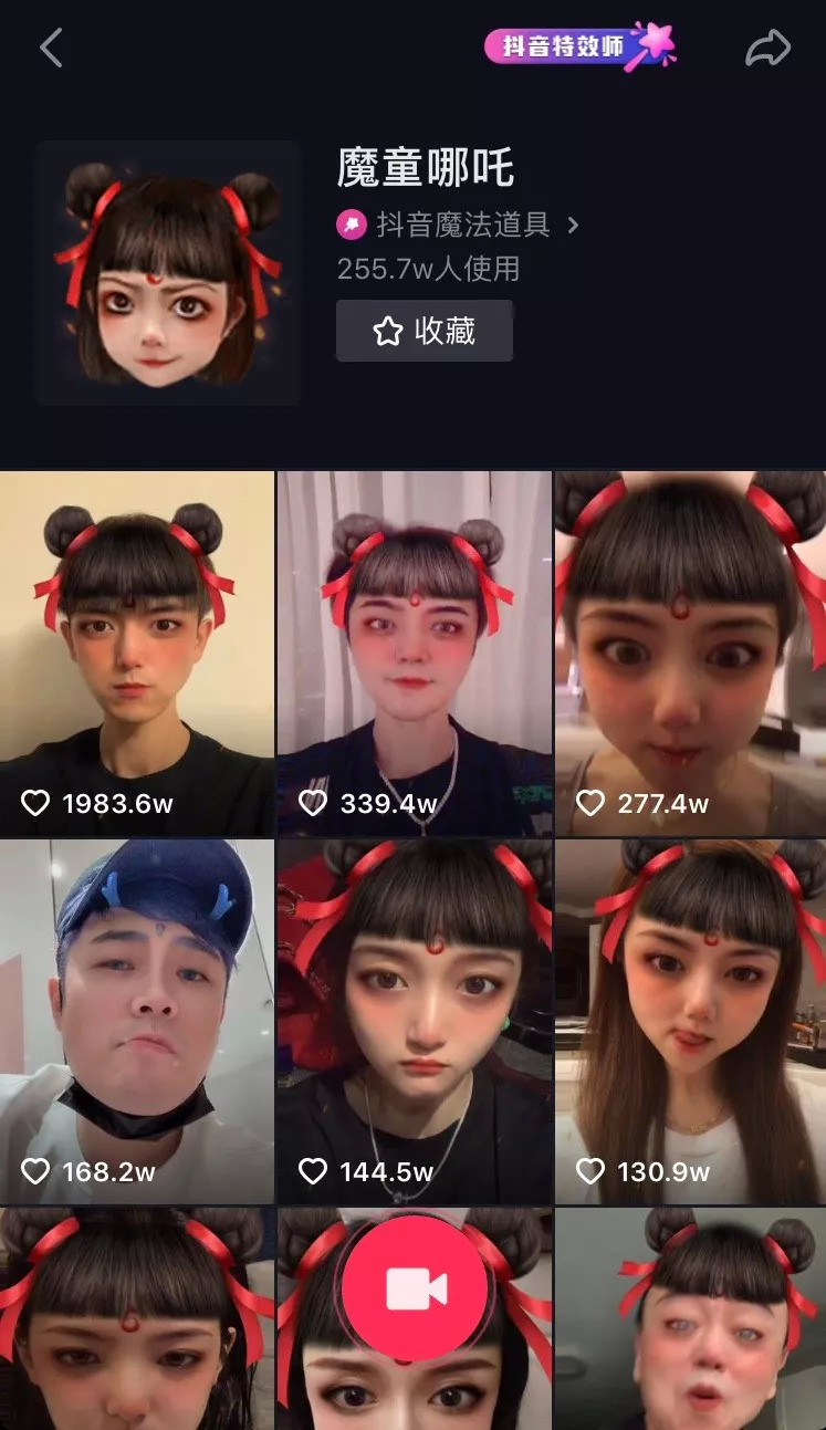 最近热映的《哪吒之魔童降世》就引起了模仿狂欢,电影中魔童哪吒的经典造型成为抖音用户的“新宠”,李现的第一个抖音视频就用了这款道具,搞怪的造型,萌萌的自我介绍,让李现一个视频圈粉千万,该视频也获得了近2000万点赞。