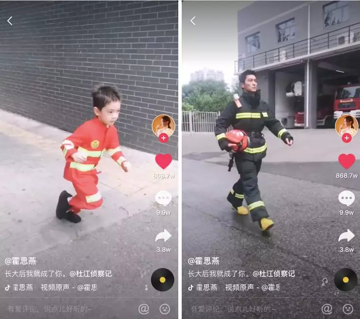 《烈火英雄》上映期间,霍思燕为电影打call,发了一段抖音,用到的也是前段时间很流行的瞬间移位“变身”视频。只见视频中儿子嗯哼往前奔跑,穿过消防车,走出的却是消防员杜江。这个“长大后我就成了你”的视频获得了868.7万点赞,评论近10万。