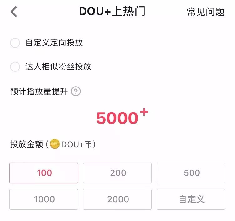 “Dou+”是抖音推出的营销工具,购买使用后,视频会出现在抖音首页的推荐流里。而流量的多少取决于金额的大小,“Dou+”给出的价格还算亲民,从100到2000分五等,还可以自定义金额,最高不超过10万。犀牛娱乐从某抖音影视营销公司中得到一份表单,其中“Dou+”的投放占比最大,达到40万。