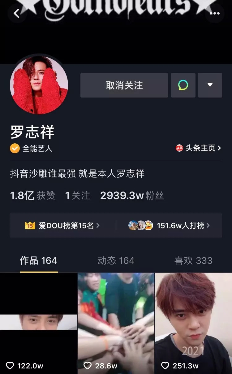 贴近大众,下沉到群众队伍与大家打成一片的明星才能在抖音玩得开,这一类最具代表的明星莫过于罗志祥。罗志祥在抖音完全没有明星的包袱,搞怪、接地气、放飞自我,自称“抖音沙雕谁最强就是本人罗志祥”,也因此罗志祥获得大家的喜爱,粉丝2939万,视频点赞量达到惊人的1.8亿。