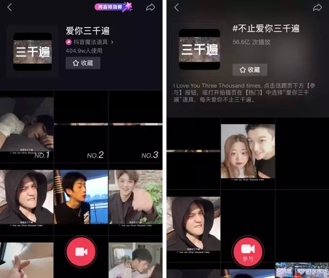 《复联4》上映期间,钢铁侠的一句“I love you three thousand times”令无数漫威粉丝飙泪,以这句经典台词制成的“爱你三千遍”的道具也引爆抖音,连罗志祥也跟风进行拍摄。该道具的使用者达到了404.9万人,其中#不止爱你三千遍的话题更是高达56.6亿次播放量。