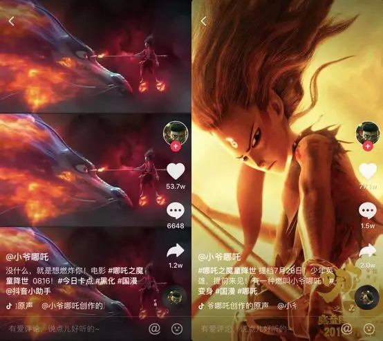 这一招《哪吒之魔童降世》就运用的比较好,在定档8月16日时,《哪吒》抖音官方账号就发布了好几个视频,将预告片中最燃最炸的部分放在了抖音,其中一个视频点赞达到53万;提档7月26日时,《哪吒》又剪了一个“变身”视频,点赞比之前更多,达77万。