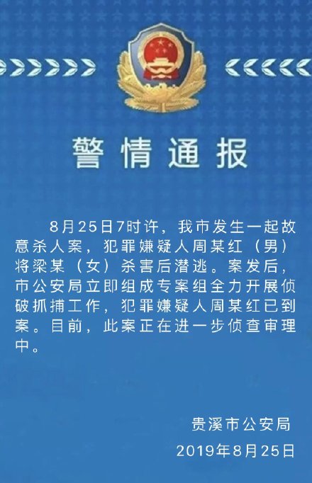 据江西贵溪公安通报,8月25日7时许,我市发生一起故意杀人案,犯罪嫌疑人周某红(男)将梁某(女)杀害后潜逃。案发后,市公安局立即组成专案组全力开展侦破抓捕工作,犯罪嫌疑人周某红已到案。目前,此案正在进一步侦查审理中。