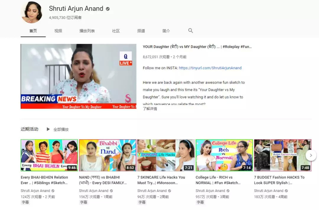 她在印度 YouTube 网站上坐拥前两大美容频道:其中,Anaysa 频道主要是教初学者如何画眼线和在家做美甲,该频道的订阅量达 519 万,排名第一;其同名频道 Shruti Arjun Anand 的订阅用户数则为 337 万,排名第二。