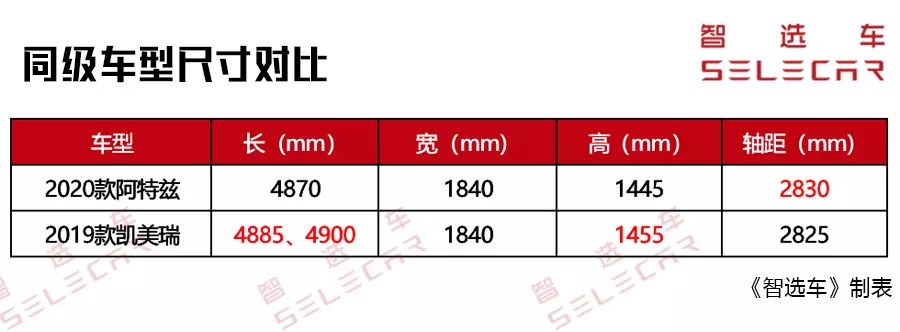 从这两款中型车的车身尺寸对比来看,新款阿特兹在长度和高度上明显不如凯美瑞,不过其轴距比凯美瑞长出了5mm。