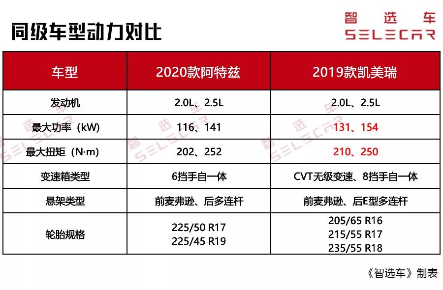 新款阿特兹和凯美瑞都搭载了2.0L、2.5L两款自然吸气发动机。通过直观的动力参数对比,凯美瑞的最大功率和最大扭矩都要优于新款阿特兹。