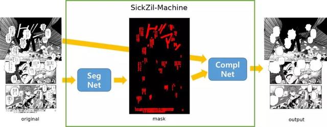 SegNet负责识别文本区域,CompNet负责删除文本区域,最终输出没有文字的漫画原图。SegNet的灵感来自U-net 图像分割技术,该技术最初是用在医学图像领域,但其性能和结果都很好,也被用在了其它很多领域里。