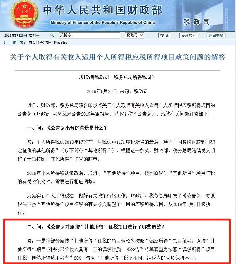 为贯彻落实修改后的《中华人民共和国个人所得税法》,做好政策衔接工作,现将个人取得的有关收入适用个人所得税应税所得项目的事项公告如下: