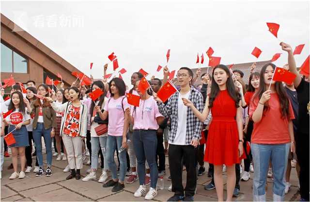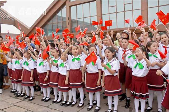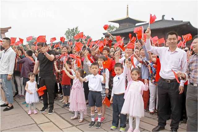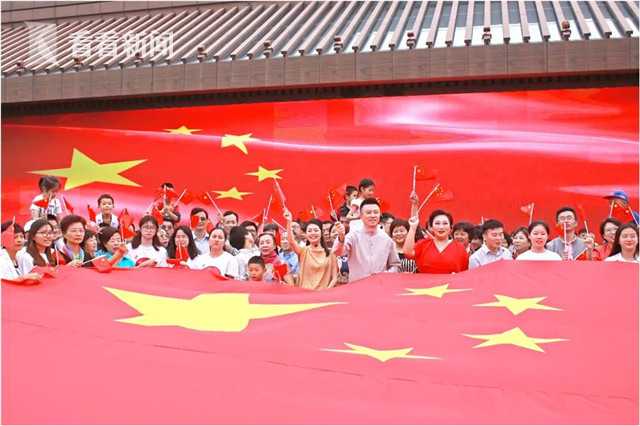 近日,在松江广富林遗址公园,一场《我和我的祖国》快闪活动给游客带来惊喜。现场红旗飘飘,人们纷纷表达对祖国的深挚祝福。