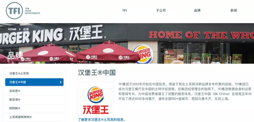 小食代翻阅的该公司官网显示,TFI是全球最大的汉堡王加盟商,在土耳其和中国拥有近1700家汉堡王餐厅。另外,其旗下运营的餐饮品牌还包括炸鸡连锁品牌派派思,意大利风味连锁品牌胜百诺,土耳其餐饮品牌阿拜斯、土耳其旋转烤肉、D NER STOP和USTA P DEC 。
