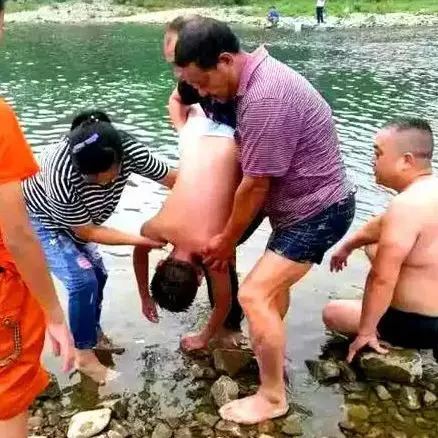 像很多网上流行的溺水急救法一样,孩子爸爸本能地把孩子倒过来拍背,想倒过来「控水」,把水排出来。