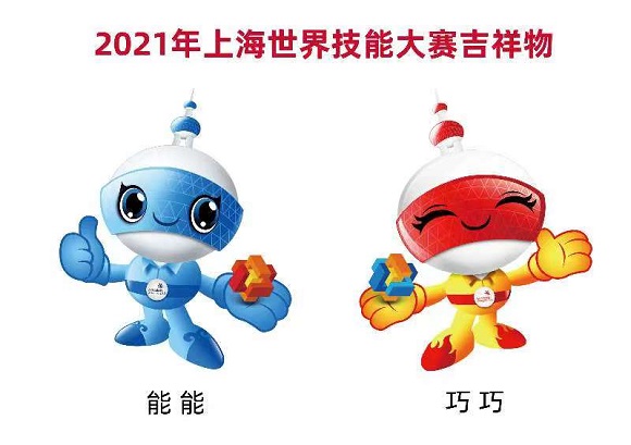 经过全社会公开征集,2021年第46届世界技能大赛吉祥物确定为男、女一组卡通图案,男孩叫“能能”,女孩叫“巧巧”,寓意“能工巧匠”。吉祥物整体造型是上海地标建筑——东方明珠,他们身着工装服,戴着防护镜和工作手套,手上托着代表传统工匠精神的鲁班锁,竖起大拇指,敞开双臂,欢迎全球技能健儿来到上海同台竞技,合作交流。