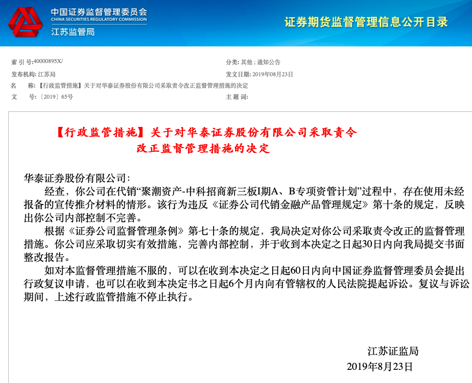 8月26日,江苏证监局发布公告称,经查,华泰证券在代销“聚潮资产-中科招商新三板I期A、B专项资管计划”过程中,存在使用未经报备的宣传推介材料的情形。该行为违反《证券公司代销金融产品管理规定》第十条的规定,反映出公司内部控制不完善。