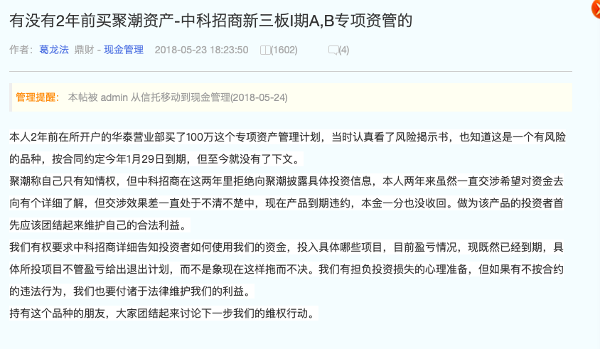 据悉,聚潮资管中科招商新三板资管计划分AB两期计划,共发行1.8亿元,于2018年1月29日到期。该资管计划由浙商基金下属机构上海聚潮资产管理有限公司担任管理人,华泰证券为资金托管方和销售方,