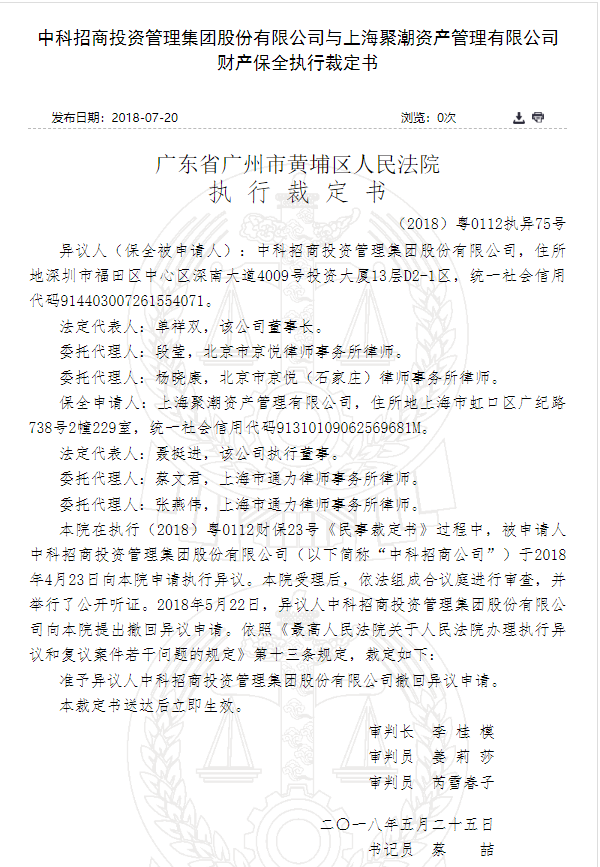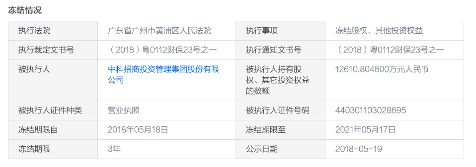 裁判文书网信息显示,广东省广州市黄埔区人民法院于去年5月25日发布财产保全执行裁定书。根据裁定书透露的信息,聚潮资产已向法院申请了对中科招商的财产保全。界面新闻记者查阅后发现,中科招商被冻结资产金额为1.26亿元,冻结期限为3年。
